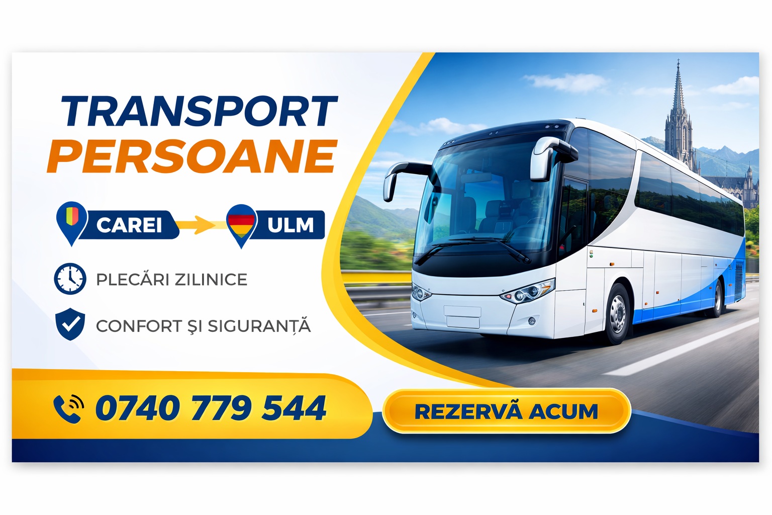 Cum rezerv transport persoane Carei Ulm? Trimiți cererea de rezervare online, iar confirmarea se face în funcție de cursa disponibilă.